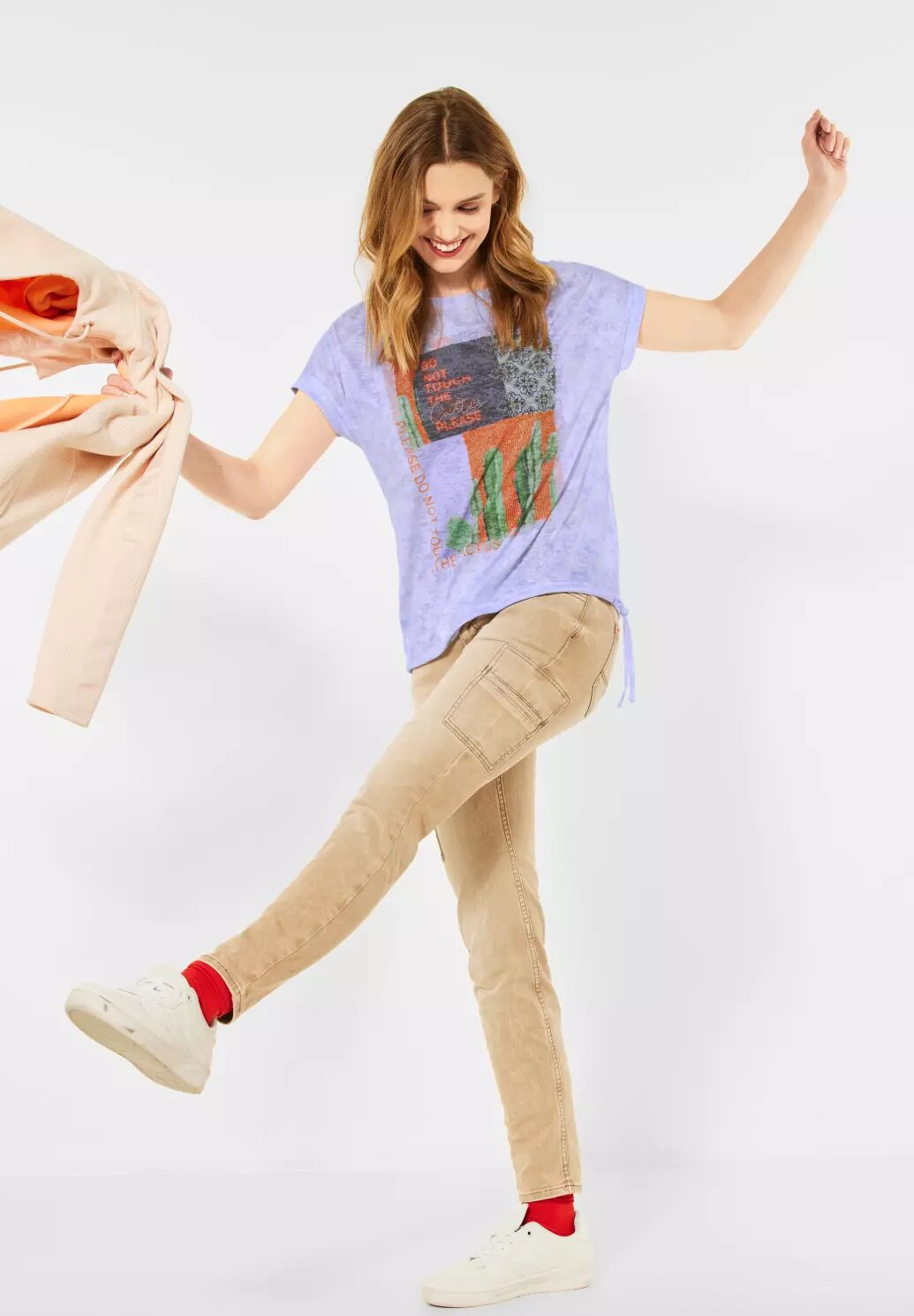 Pohodlné tričko od Street One so ženským vzhľadom. Znížené ramená, okrúhly výstrih a šnúrka v leme zaručujú ležérne nosenie.Tričko žiari jemným batikovaným vzorom, ktorý je vpredu zvýraznený fototlačou. Malé ozdobné kamienky dodávajú ďalšiu porciu pôvabu!