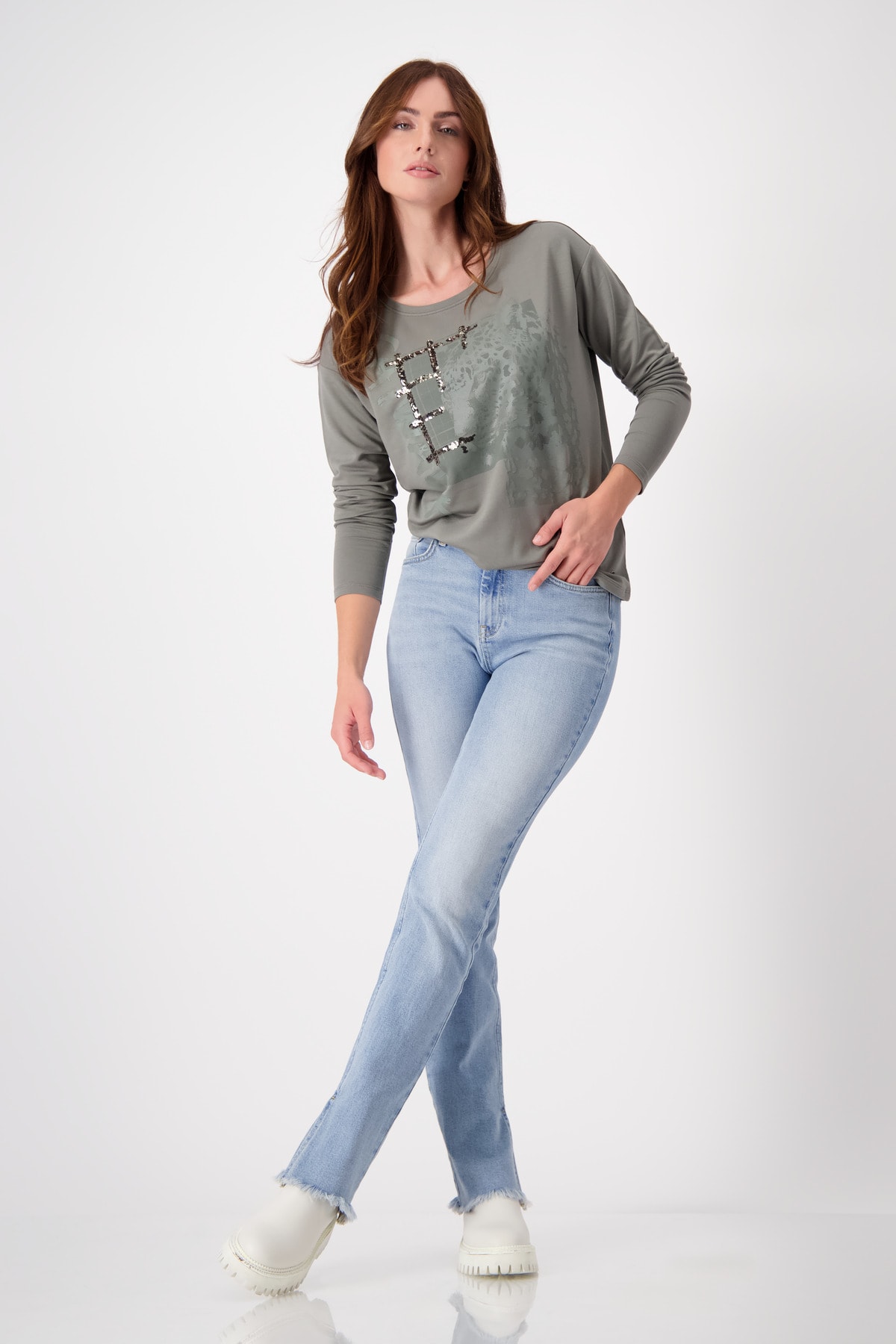 V kombinácii s trblietavým flitrovým károvaným vzorom si štýlovo príde na svoje tónová, lesklá leopardia potlač na prednej strane košele s miernym pásom.