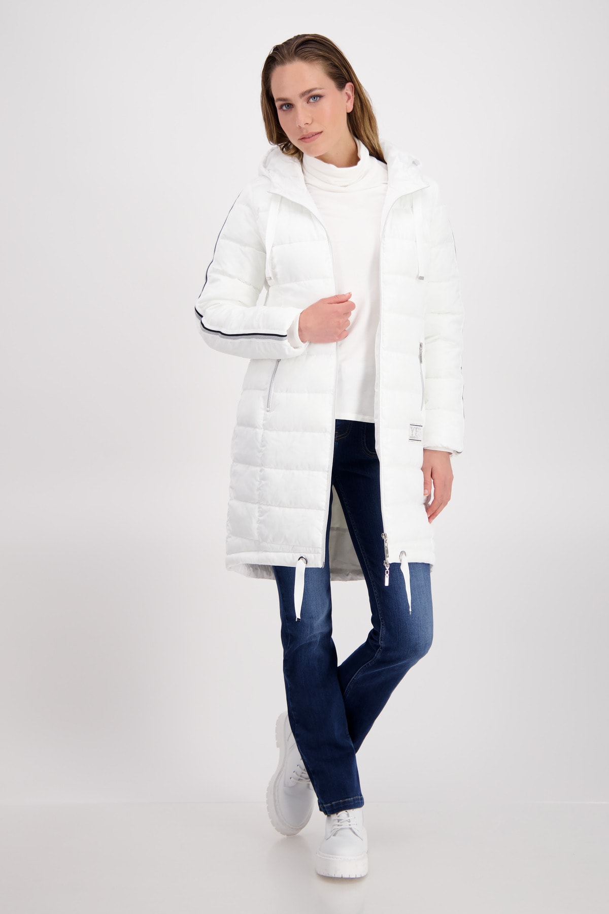 Prešívaný kabát má dlhú, voľnú siluetu s kapucňou. Dlhé rukávy zdobí stuha zdobená prúžkami a trblietkami a zdobená nášivka.