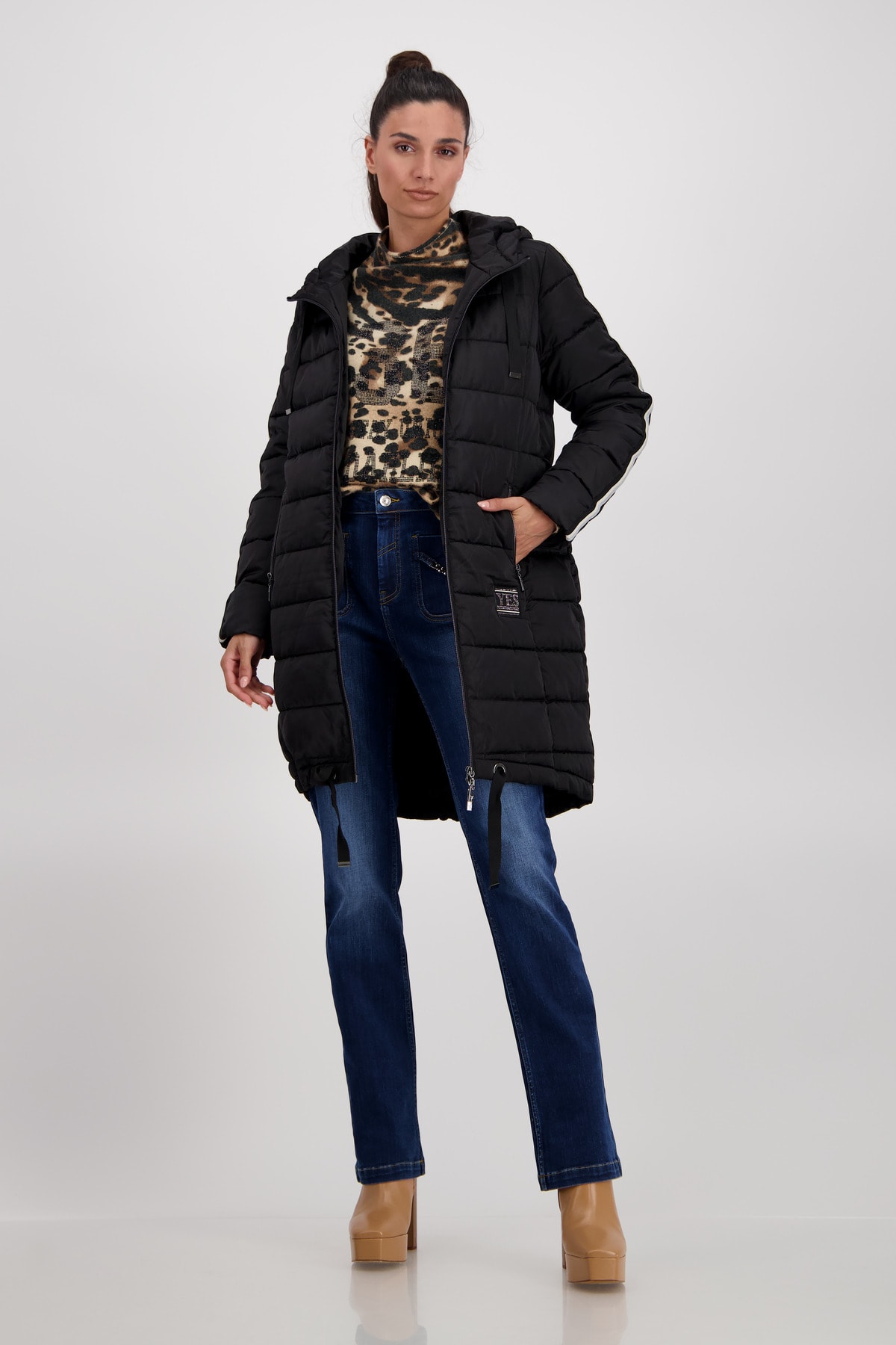 Prešívaný kabát má dlhú, voľnú siluetu s kapucňou. Dlhé rukávy zdobí stuha zdobená prúžkami a trblietkami a zdobená nášivka.